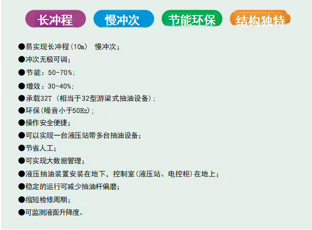 Гидравлическое насосное оборудование из-за его энергосбережения, высокой эффективности, управляемости привлекло внимание нефтяных месторождений в стране и за рубежом, особенно насосное оборудование с длинным ходом и медленным ходом, которое более приветствуется, мы на протяжении более десяти лет исследований и разработок продуктов и исследований, двухскважинное (или многоскважинное) энергосберегающее гидравлическое насосное оборудование, чтобы достичь хода гидравлического насосного оборудования до 10 м, два новых типа скважинного гидравлического насосного оборудования были успешными.